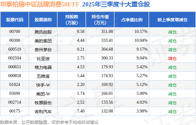 从基金边界来看,华泰柏瑞中证品牌消耗50ETF基金2025年三季度公布的基金边界为0.33亿元,较上一期边界3399.64万元变化了-78.47万元,环比变化了-2.31%。该基金最新一期金钱成就为:股票占净值比96.25%,无债券类金钱,现款占净值比3.73%。从基金捏仓来看,该基金当季前十大股票仓位达67.63%,第一大重仓股为腾讯控股(00700),捏仓占比为10.57%。